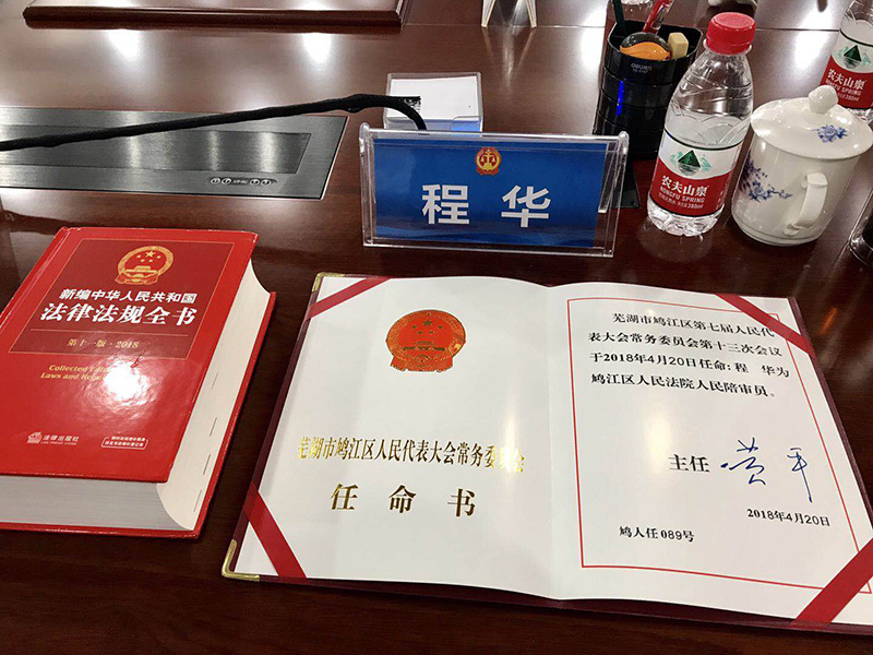 2018年5月24日,鳩江區(qū)人民陪審員受聘任命大會在蕪湖經(jīng)濟技術(shù)開發(fā)區(qū)人民法院一號會議室勝利舉行。公司董事長程華經(jīng)蕪湖市鳩江區(qū)第七屆人民代表大會常務(wù)委員會第十三次會議通過,任命為鳩江區(qū)人民法院人民陪審員,任期5年。